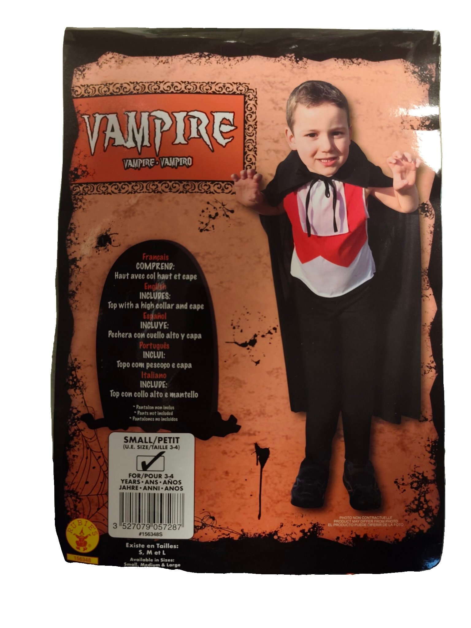 Ce costume de vampire pour enfant, présenté dans son emballage d’origine de la marque Rubie’s, adopte un style classique et élégant pour Halloween ou les fêtes déguisées.