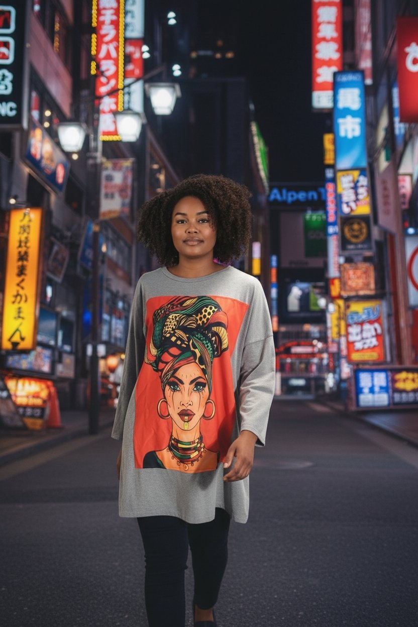 L’ensemble donne un style urbain, artistique et affirmé, facile à porter avec un legging ou un pantalon ajusté, comme sur l’image.