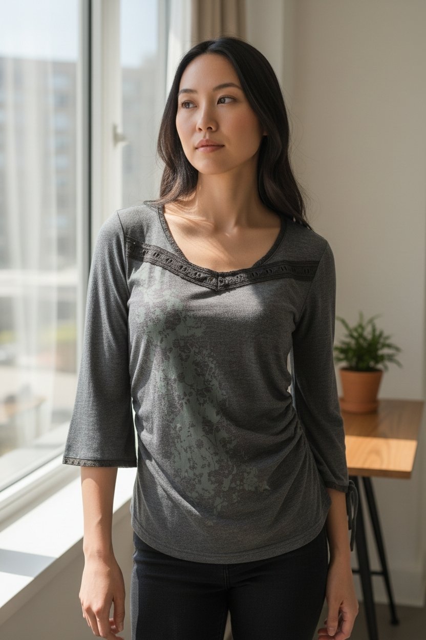 Les manches 3/4 sont agrémentées de petits liens à nouer au bas, permettant d’ajuster légèrement la manche et d’apporter un détail original. La coupe est près du corps mais confortable, mettant subtilement la silhouette en valeur.